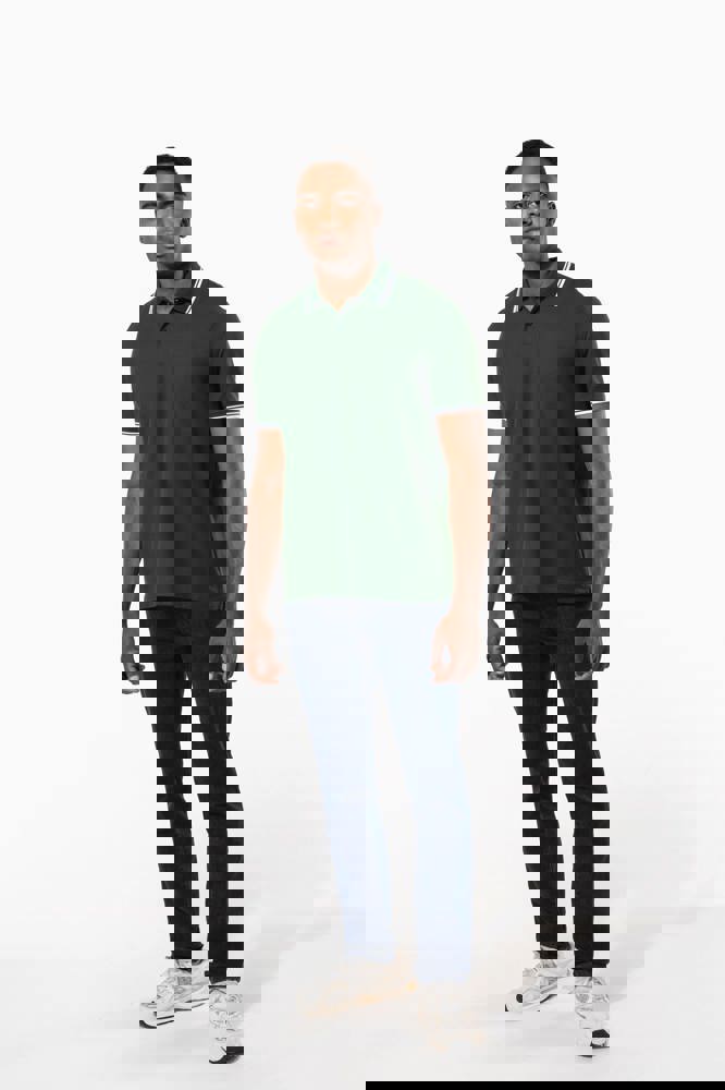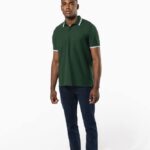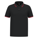 100% katoen. Voor de gevlamde kleuren: 92% katoen / 8% viscose. Gekamd katoen. Piquétricot. Rechte snit. Knooplijst met 2 toon-op-toon knopen aan de kraag. Nektape in de hoofdstof in de kraag. Zijsplitten met een afwerkingsboord in de hoofdstof. Ribboord met contrasterende biesjes aan kraag en mouwuiteinden. Dubbel stiksel aan de onderkant.