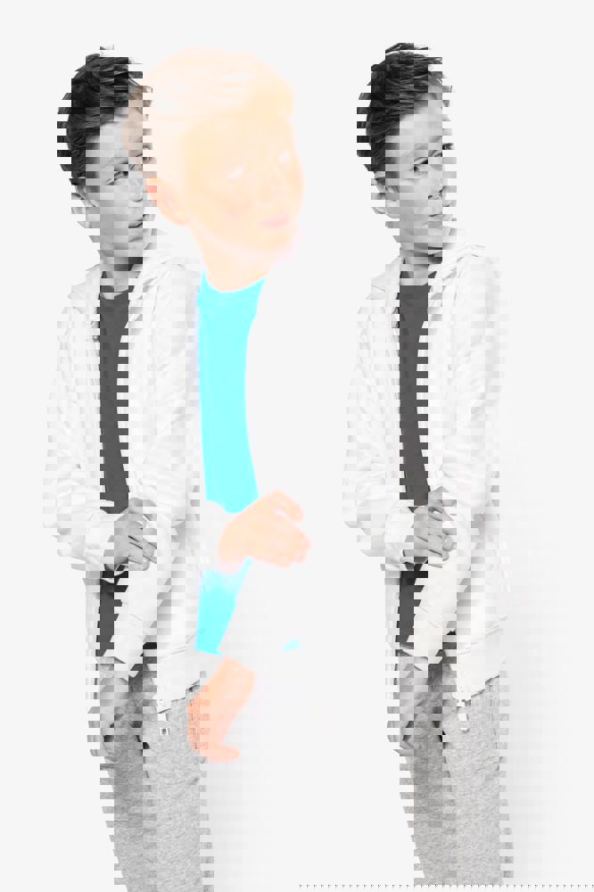 80% katoen / 20% polyester. Gekamd katoen. Geborsteld fleece aan de binnenkant. Nektape in contrastkleur. (Navy voor de kleur Oxford Grey en Oxford Grey voor alle andere kleuren). Gevoerde capuchon in honinggraatstructuur. ‘Kangaroe’ zakken. Afwerking in rib aan de zakken, mouwuiteinden en onderaan. Ritssluiting.