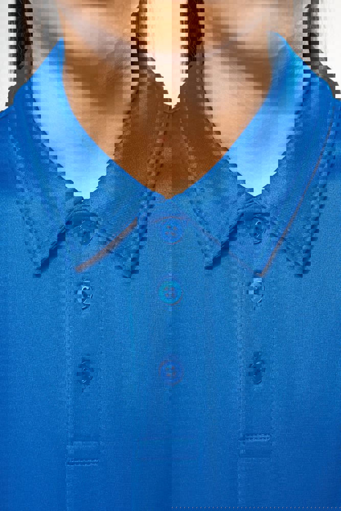 The polo consists of 50% CoolPlus® polyester. The remaining 50% is polyester. This material ensures the polo is breathable. It features a placket with three buttons. Double stitching provides a neat finish. The polo is available for children aged 8, 10, 12, and 14 years. Available colours include Navy, Lime, Red, and Aqua Blue.