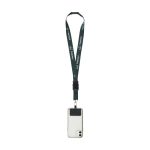 The lanyard is made from strong woven RPET polyester. This material comes from recycled PET bottles. Its width is 2 cm. It includes a metal carabiner. A universal smartphone patch is also present. There is a plastic safety buckle. The lower part detaches with a click system. The smartphone patch works with most phone and case combinations. Cases with an open bottom are not compatible. The charging port remains unblocked. Your design is applied via full-color sublimation printing. This product is Made in Europe.