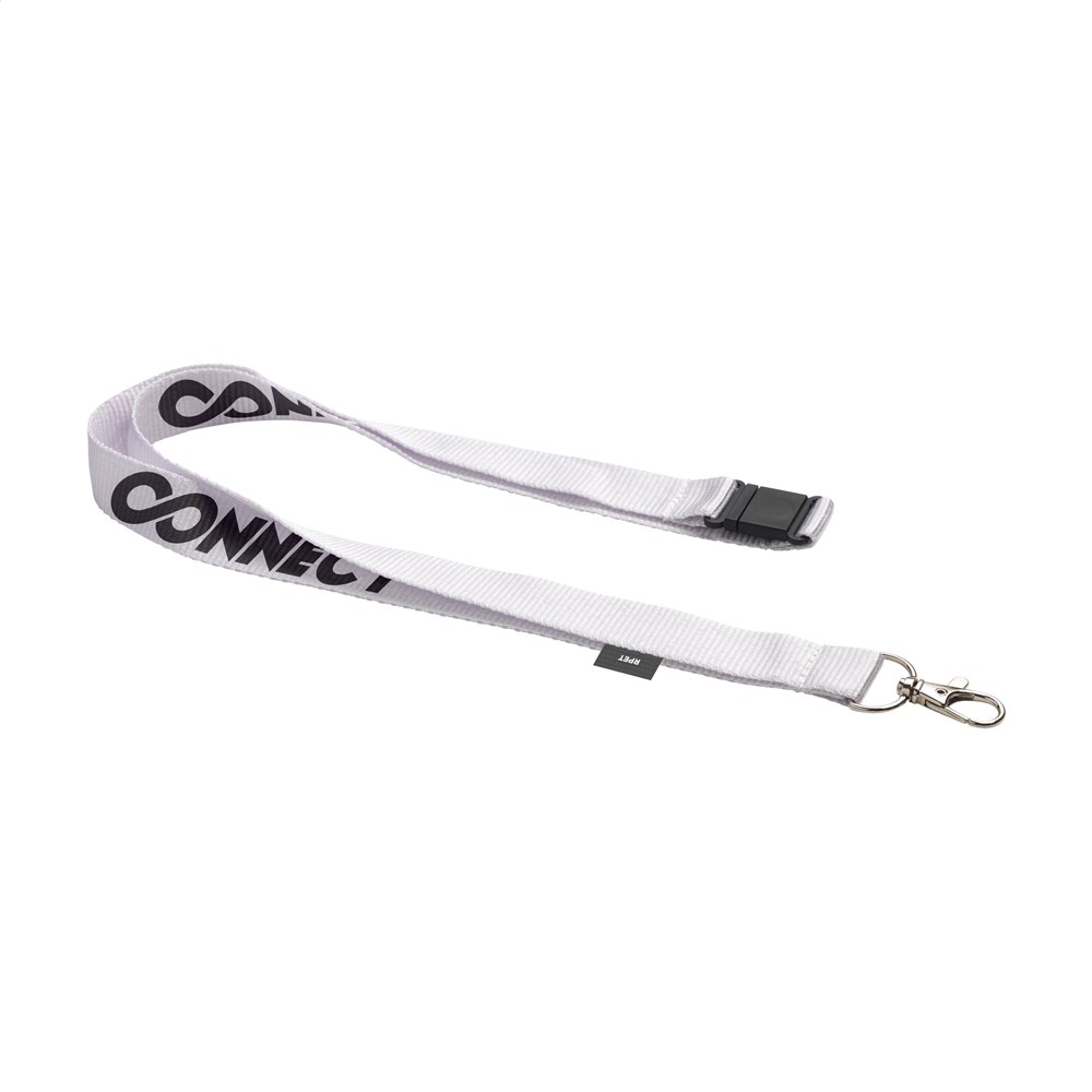 Lanyard made from RPET: recycled PET bottles. With metal carabiner and safety clip. GRS-certified. Total recycled material: 58%.