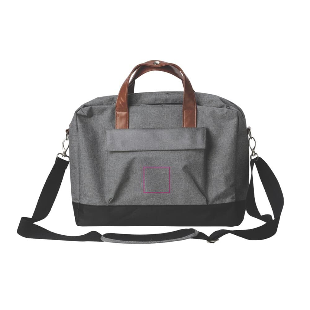 This is the Brixton Laptop Bag. It is made from reinforced 300D polyester. You can use this bag for business, associations, or events. It is designed to carry multiple devices securely.
