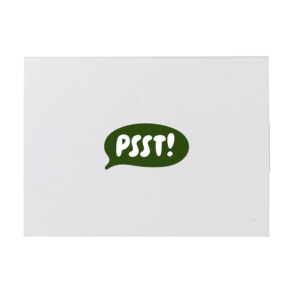 This is a recycled memo block. It includes self-adhesive notes and marker stickers. The block features a softcover made from recycled paper.