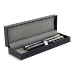 The set contains two writing instruments. One is a metal ballpoint pen. The other is a metal rollerball pen. Both pens have a durable metal construction. The color is dark gun metal. They are presented in a matching gift box. This gift box adds value to the set. This product is a variable type.