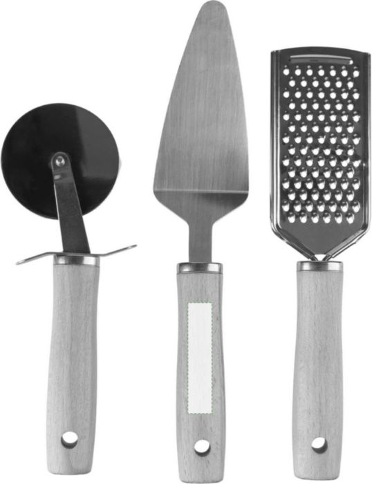 You are looking at a 3-piece kitchen tool set. This set includes essential cooking utensils. It features a stainless steel grater, a pie server, and a pizza cutter. Each tool has a comfortable wooden handle. The set comes packaged in a natural cotton drawstring bag. This kitchen tool set is ideal for promotional use.