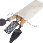The set contains three distinct kitchen tools. These tools are a stainless steel grater, a pie server, and a pizza cutter. Each tool is crafted with durable stainless steel. They all come with ergonomically designed wooden handles. The set is neatly presented in a reusable cotton drawstring bag. The color of the wooden handles is brown.