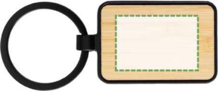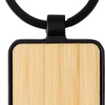 The keychain combines durable black metal with sustainable bamboo.