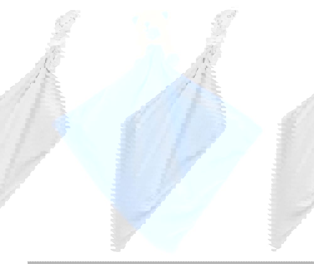 The comforter is made from 100% polyester. It features a soft fabric with padded thickness. A gentle rattle is securely placed inside each comforter. Choose between the Pink Rabbit or Blue Bear design. It complies with the European toy safety standard EN71. This comforter is suitable for all ages.