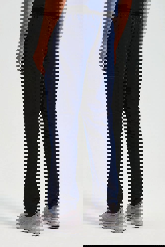 These trousers are crafted from a blend of 42% polyester, 33% recycled polyester, 19% viscose, and 6% elastane. This material composition ensures stretch and breathability. The design includes practical zip pockets for secure storage. A partially elastic waistband offers enhanced comfort. They also feature a faux fly and splits in the hem for ease of movement. The Stretch Cargo Trousers are available in sizes S to 3XL. Color options include Navy, Black, Ceil blue, Clean Green, and Dynamo Grey.