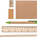 This is a compact non-woven pencil case set. It provides a convenient stationery solution. The set is ideal for promotional activities. It is made from 80 gr/m² non-woven material. The color is khaki-ecru. This set includes a ruler, a pen, a pencil, a sharpener, an eraser, and a notepad. The pen writes in blue ink.