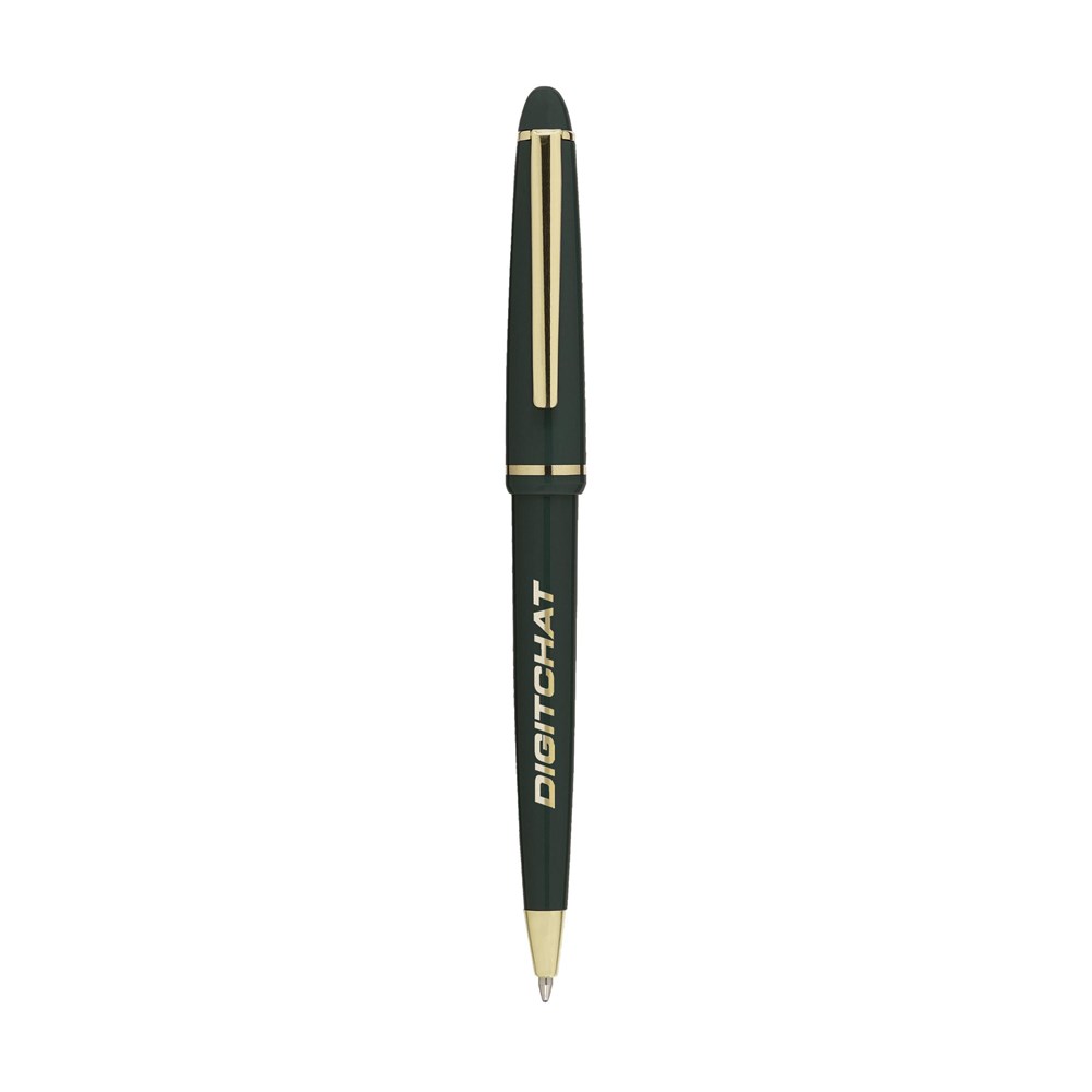 The pen has a high-gloss polished barrel available in black, blue, green, and bordeaux. It contains a blue-writing refill for all standard writing tasks. The clip and the tip are gold-plated for a decorative effect. The pen uses a sliding cap pressure system to operate the refill. This product is a variable type with different color options.