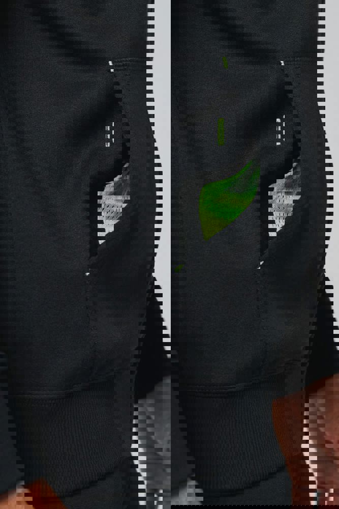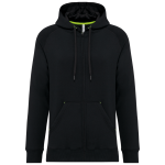 The zipped jacket consists of 65% polyester and 35% cotton. It uses Vortex yarn. It features combed cotton for softness. The interior has a brushed fleece lining. This jacket offers a straight cut. It comes with raglan sleeves. A sturdy nylon zipper is included. The hood is lined with a tone-on-tone mesh. It has practical kangaroo pockets. One pocket includes a fluorescent mobile phone pouch. Neck tape is present inside the hood. Eyelets are provided for hood drawstrings. Fluorescent stoppers are located on the pocket drawstrings. The sleeve cuffs and bottom hem are made from double-thick 2x2 rib knit.