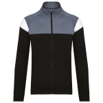 The training jacket is made from 100% matt interlock polyester. It offers a comfortable straight cut design. The front closes with a reversed tone-on-tone nylon zipper. It incorporates raglan sleeves. Contrasting inserts are located on the shoulder and chest. You will find two practical front zip pockets. Textured fabric inserts are present on the sides and back. A zipper cover at the collar top enhances comfort. Available sizes range from XS to 4XL. You can choose from Navy, Black, or Sporty Grey colors.