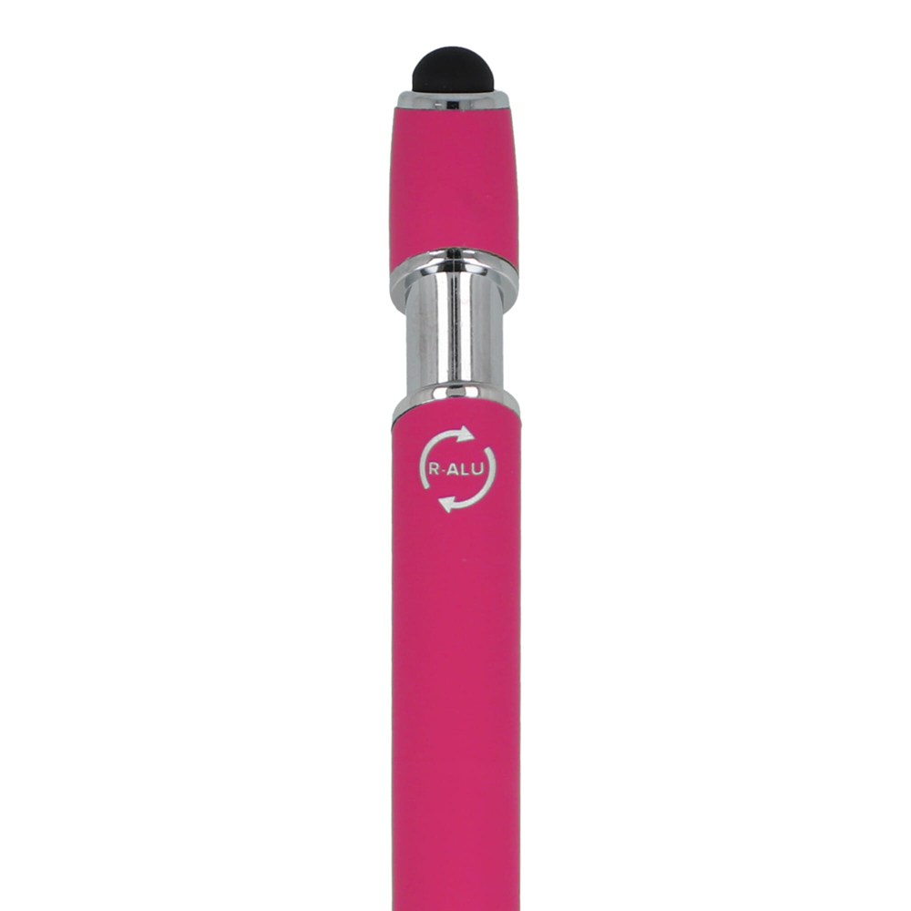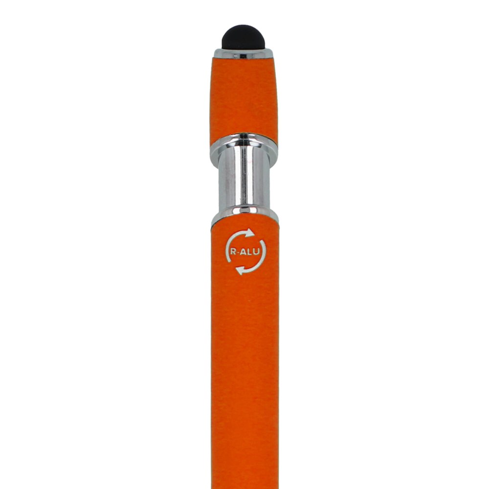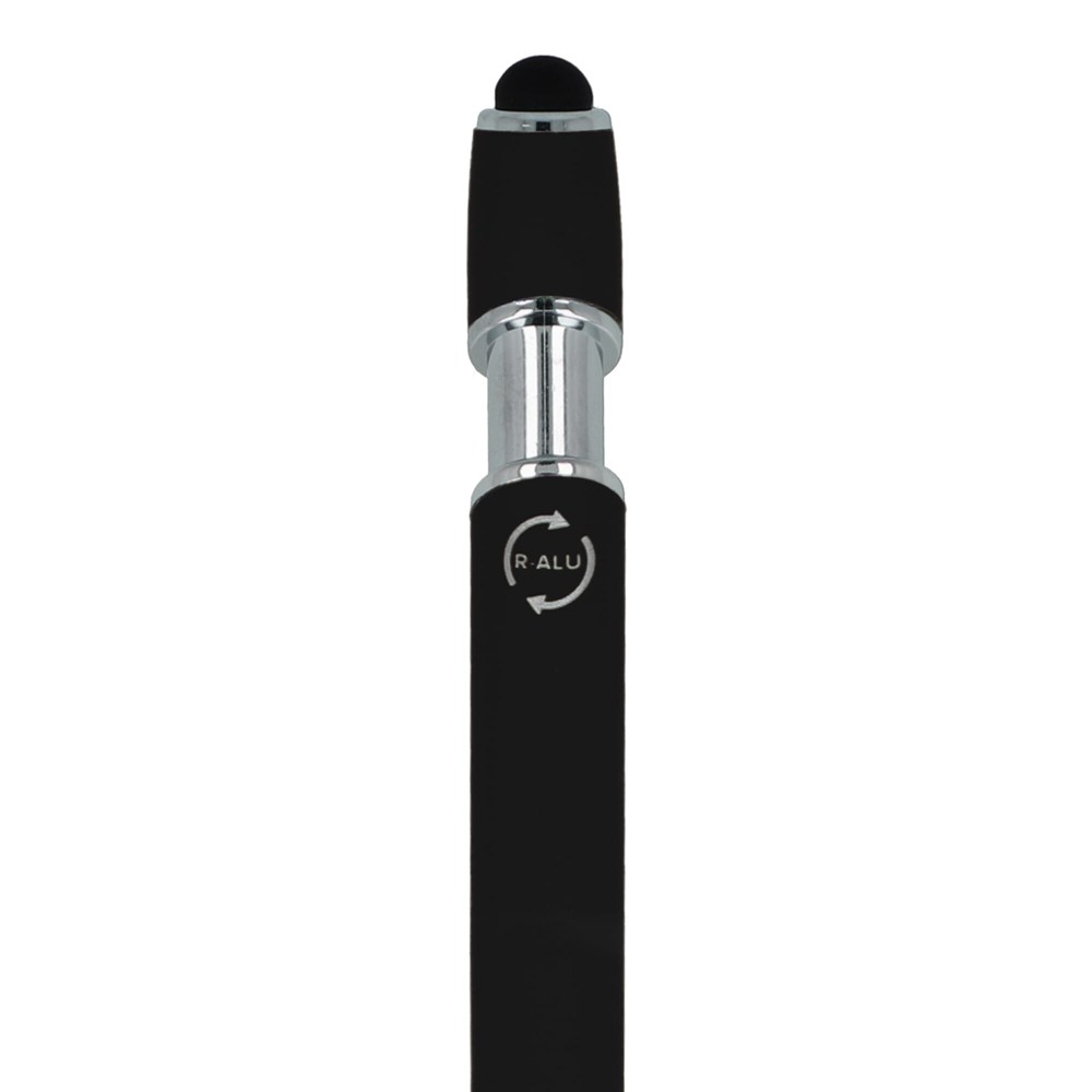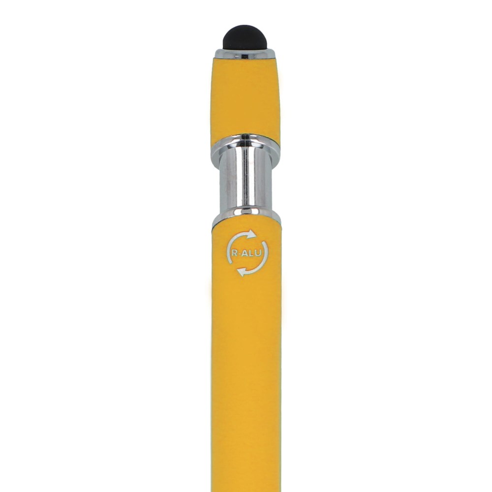 The pen is crafted from recycled aluminum, supporting sustainable practices. It features a soft-touch finish for a comfortable grip. The ink color is black, ensuring clear and professional writing. The design includes a sturdy clip for easy attachment to notebooks or pockets. Available colors include White, Black, Red, Grey, Orange, Yellow, Blue, Dark Blue, Light Blue, Light Green, Pink, Dark Green, and Dark Red.