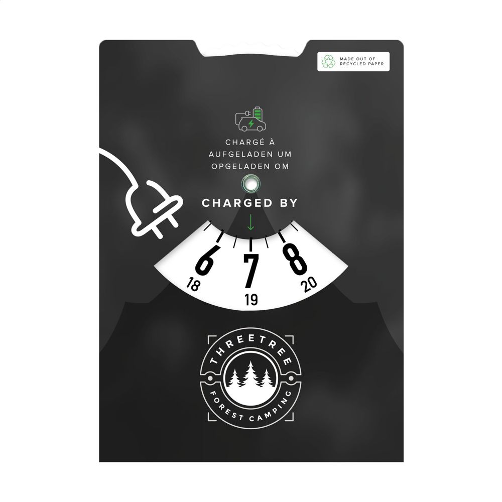 This disc is made from recycled paper. It combines two essential functions: a charging disc and a parking disc. The product is legally approved for use in traffic. All necessary texts are displayed in multiple languages. This is a Made in Germany product. It includes full-colour print on the charging disc side.