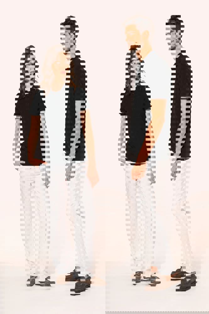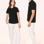 95% katoen / 5% elasthan. Piquétricot van Supima® katoen. Heel fijne, zachte en zijdeachtige stof van grote kwaliteit. Kraag in 1×1 ribboord, ton-sur-ton nektape aan de binnenkant van de kraag. Ton-sur-ton lijst met 2 knopen. Versteviging van de schoudernaad met een silicone bandje. De mouwuiteinden en onderkant zijn afgewerkt met een zoompje met dubbel stiksel. Geen merklabel in de kraag, maar enkel een maatlabel voor eenvoudige personalisatie.