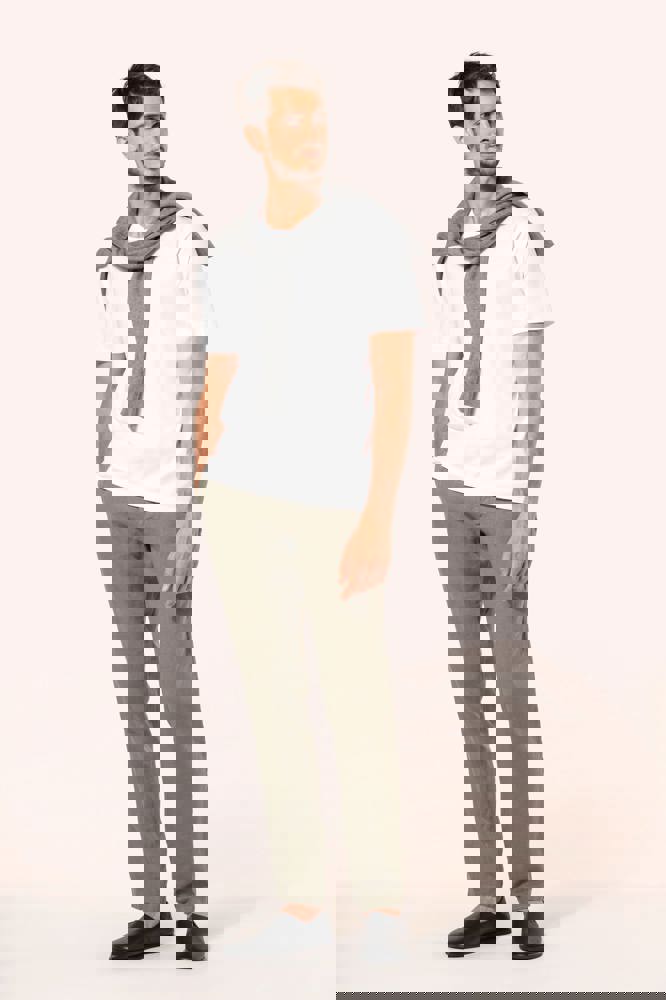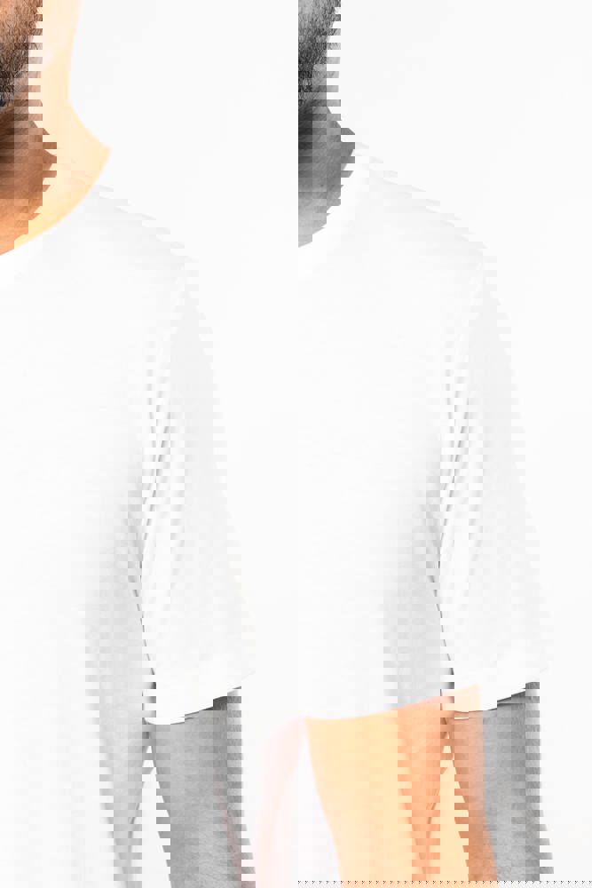 100% katoen. Tricot van gekamd Supima® katoen. Heel fijne, zachte en zijdeachtige jersey van grote kwaliteit. Gesneden en genaaide constructie. Ronde hals met ton-sur-ton nektape. Versteviging van de schoudernaad met een silicone bandje. De mouwuiteinden en onderkant zijn afgewerkt met een zoompje met dubbel stiksel. Geen merklabel in de kraag, maar enkel een maatlabel voor eenvoudige personalisatie.