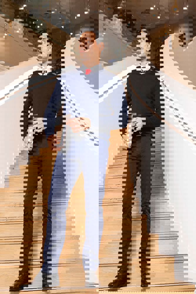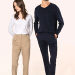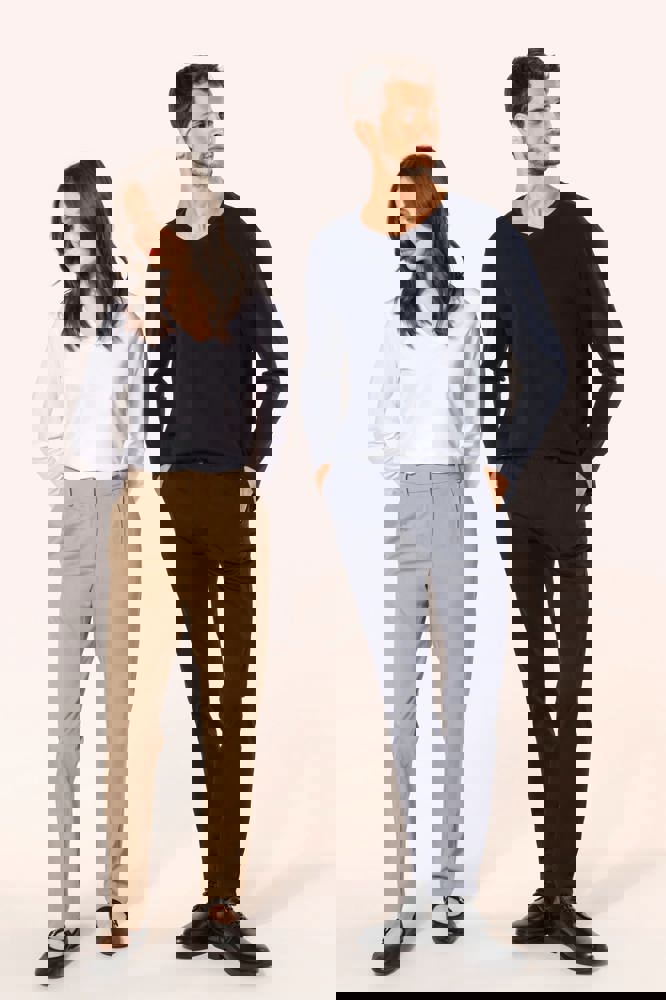 98% katoen / 2% elasthan. Twillstof. Twee Italiaanse zakken op de voorkant, met een toon-op-toon bies en biesstiksel. Aan de rechterkant (bij het dragen) zitten een ticketzak en een muntzak. Twee omzoomde achterzakken met verstevigend stiksel en toon-op-toon knopen met marmerlook. Gulp met metalen rits en toon-op-toon knoop met marmerlook. Tailleband met lussen. De tailleband, gulp en zakken zijn binnenin afgewerkt met een subtiel, toon-op-toon streepje in gebroken wit voor alle kleuren. Geen merklabel, maar enkel een maatlabel voor eenvoudige personalisatie.