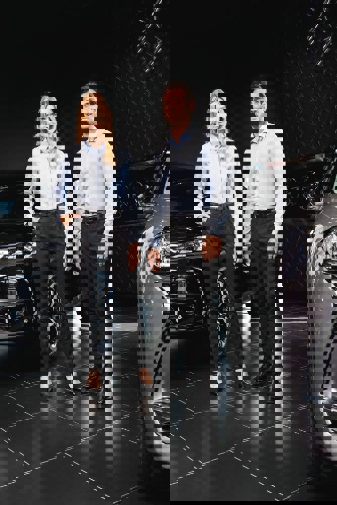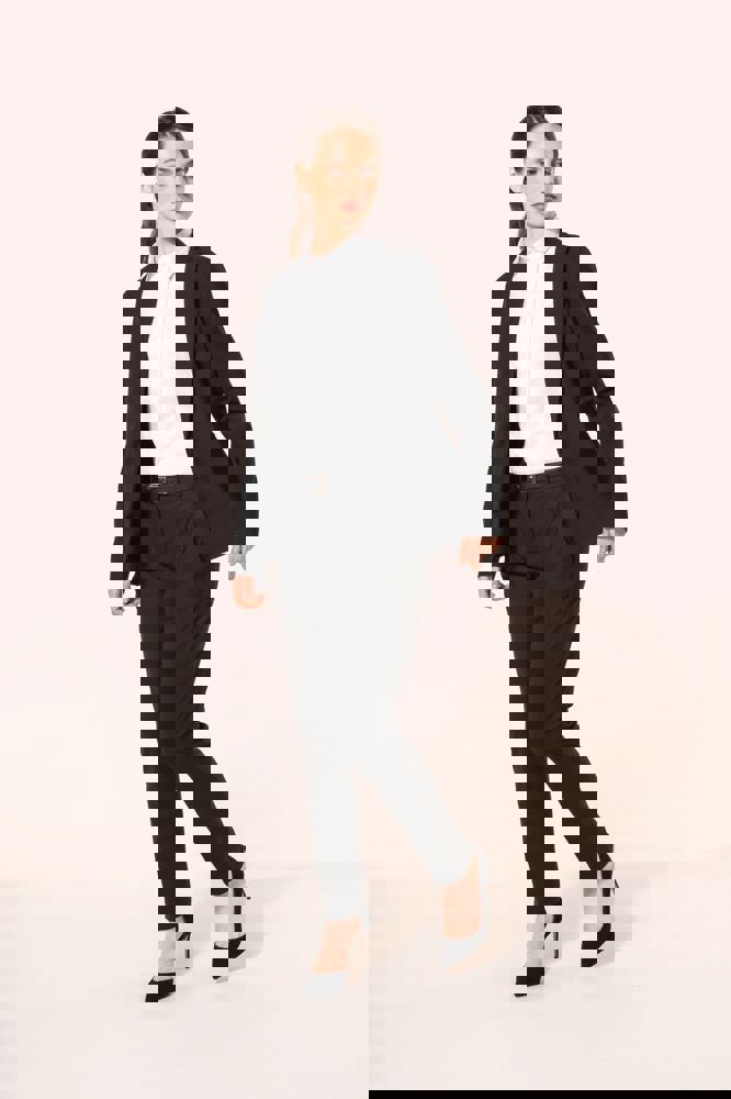 50% polyester / 23% viscose / 22% wol / 5% elasthan. Ton-sur-ton voering in 100% polyester. Broek met fitted pasvorm. 2 zijzakken. 2 omzoomde achterzakken. Zak in polyestertwill. Ritssluiting met een metalen haakje, binnenin beschermd door een stoffen band. Met een knoop voor meer comfort. Lussen voor een riem op de tailleband. Biesje aan de binnenkant, op de afwerking van de tailleband. Plooien aan de voorkant van de broekspijp. Geen merklabel, maar enkel een maatlabel voor eenvoudige personalisatie.