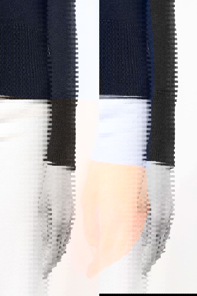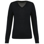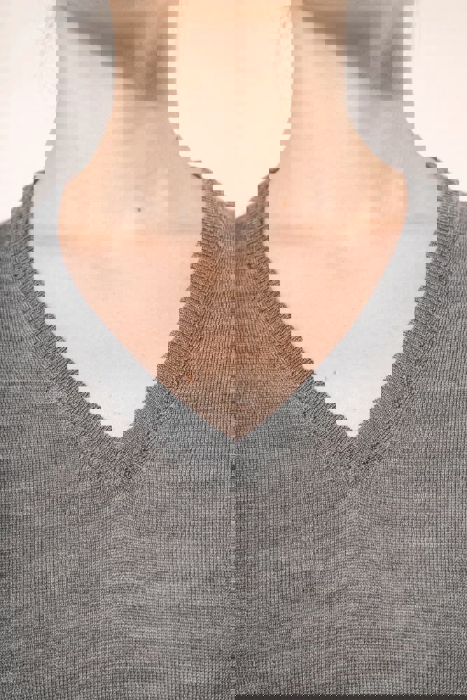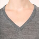 100% merino. Extra fijne gekamde wol. Gauge 14. Fully-fashioned: gebreid in de vorm en geassembleerd op de machine. Halsopening, mouwuiteinden en onderkant in 1×1 ribboord.