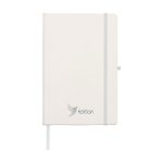 This notebook comes in A5 size. It has a hard RPET cover. The cover is made from recycled material. Inside, you will find approximately 80 sheets. This equals 160 pages of paper. The paper is cream-colored and lined. It has a weight of 70 g/m². The notebook includes an elastic closure. A convenient bookmark ribbon is attached. There is also a pen loop for easy access. Available colors include White, Black, Red, and Blue.