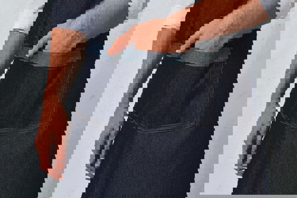 70% katoen / 30% polyester. Dit schort met bovenstuk straalt een zekere ‘industriële’ charme uit, met grote metalen ogen daar waar de linten vastzitten. De contrasterende achterkant is zichtbaar op de zakken en de linten, voor een omkeerbare stijl. Metalen gesp aan de hals om de schort in lengte aan te passen. In het midden een zak van 36 cm met contrasterende afwerking. Vak voor een pen. In het midden een zak in denim, met contrasterende achterzijde. Contrasterende linten (100 cm lang) en bevestigingssysteem met metalen oogjes. Lengte: 86 cm. Breedte: 72 cm.