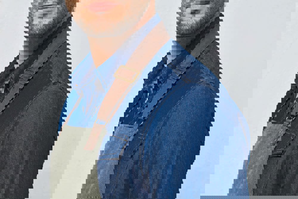 100% kleurgeweven oxfordkatoen. Halsriem van imitatieleer met regelingsgesp. Doekhouder en klinknageldetail van imitatieleer. Middenzak en gecombineerde zak voor pennen. Dubbele D-ring op de taille. Thuis wassen op 60 °C.