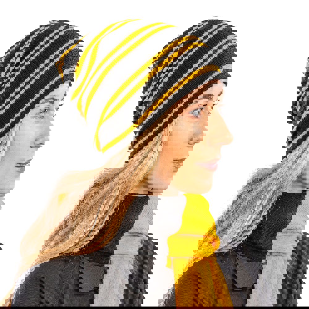 100% polyacryl. Dik breisel maat 6. Winddicht. Gestreept aan de buitenkant en uni aan de binnenkant. Lange muts voor elke gewenste stijl. De derde tint is de unikleur. Bescherming tegen koud weer. Extreem warm.