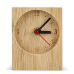 This is a rectangular desk clock. It features a compact design. The clock comes in a natural bamboo finish. It is modern and minimalist. This desk clock fits well in any workspace. You can brand this clock with your own logo.