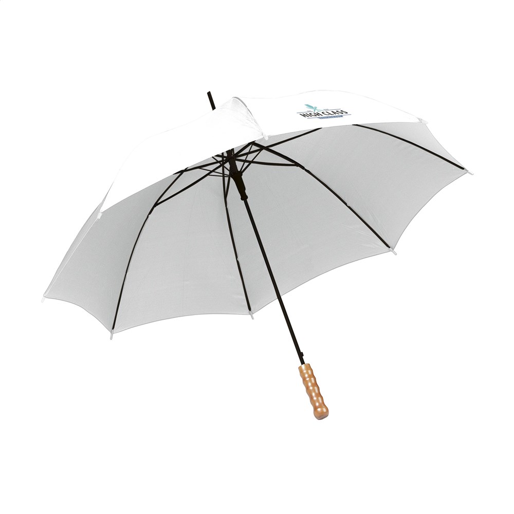 This umbrella is ideal for business clients, associations, and corporate events. You can use it as a functional giveaway during trade fairs or outdoor company gatherings. The classic wooden handle gives the product a professional and timeless look. It serves as a practical gift that recipients will use frequently in their daily lives.
