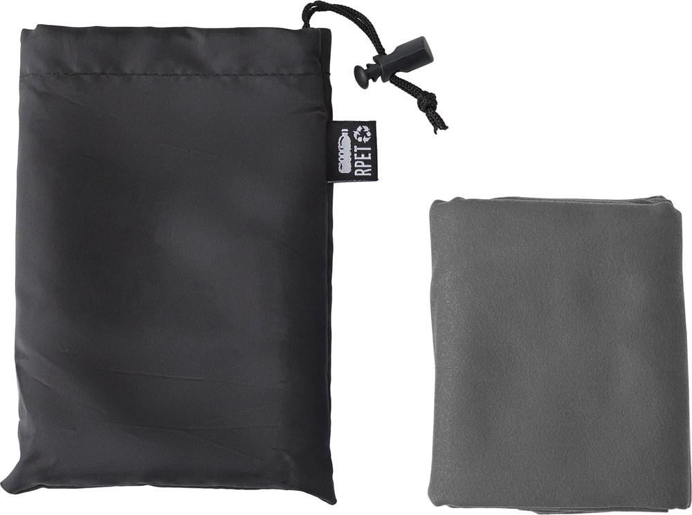 You are looking at an rPET lightweight sports towel. It measures 79 by 30 centimeters. This towel is crafted from recycled PET (rPET). It comes conveniently packed in an rPET pouch. The pouch features a drawstring closure. This item is designed for effective branding and promotion.