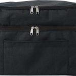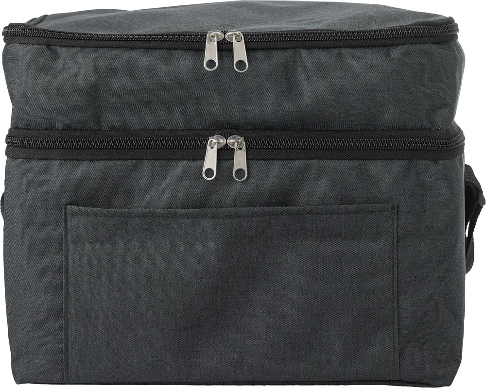 The Cooler Bag rPET Troy is made from recycled rPET material. It has insulating aluminum foil on the inside. This ensures effective cooling. The bag features two separate compartments. Both compartments have a secure zipper closure. An adjustable carrying strap is included. This allows for comfortable transport. The cooler bag is available in Black, Grey, and Blue.