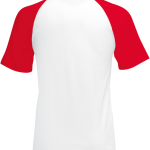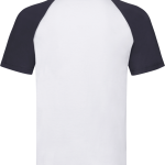 The T-shirt is made from 100% cotton. It features a round neck. The neck has a 1x1 rib cotton/Lycra® blend. It includes interlock piping. The raglan sleeves come in a contrasting color. The garment is finished with double stitching. This ensures durability. It is a high-quality product.