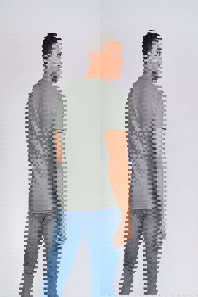 100% voorgekrompen ringgesponnen katoen “Softstyle” (Sport Grey / Antique kleuren: 90% voorgekrompen ringgesponnen katoen / 10% polyester, Heathers: 35% voorgekrompen ringgesponnen katoen / 65% polyester). Jersey. Nektape van shouder tot schouder. Dubbel stiksel op de mouwen en onderaan. Tubulaire snit. De stof is een kwartslag gedraaid om de middenvouw weg te werken.