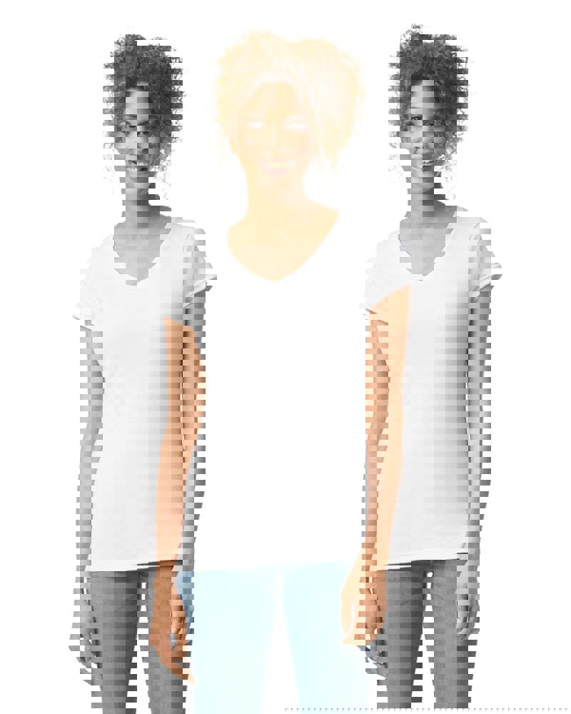 100% voorgekrompen ringgesponnen katoen “Softstyle” (Sport grey: 90% katoen / 10% polyester, Heather: 35% katoen/65% polyester). Jersey. Nektape van schouder tot schouder. Zijnaden en getailleerde snit. Mouwen en onderkant afgewerkt met dubbele stiksels.