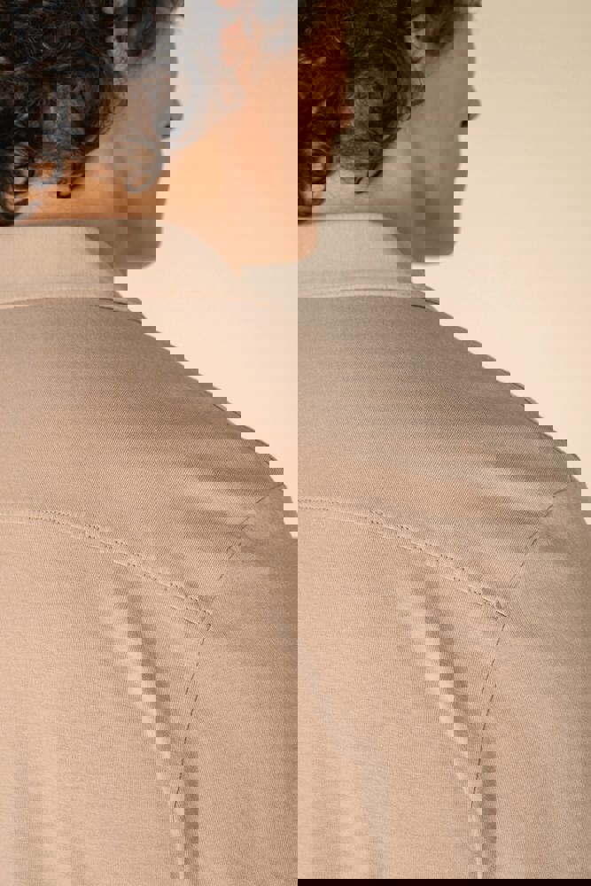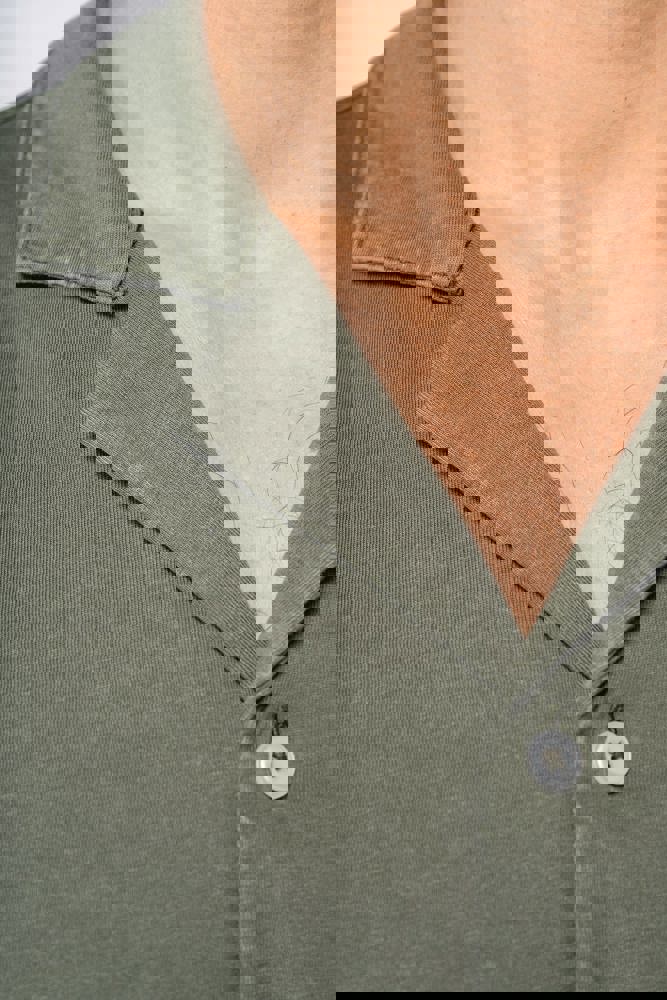 100% biokatoen. Gekamd katoen. Jerseytricot. Rechte snit. Verwassen look. Bowlingkraag. Knooplijst met contrasterende parelmoerlook knopen van gerecycled plastic. De mouwuiteinden en de boorden zijn afgewerkt met een enkel stiksel. Gevoerd rugstuk. Kledingstuk geverfd na montage: mogelijk zijn er lichte kleurverschillen tussen de producten. Dit product kan afgeven in contact met lichtere stoffen of kleding.
