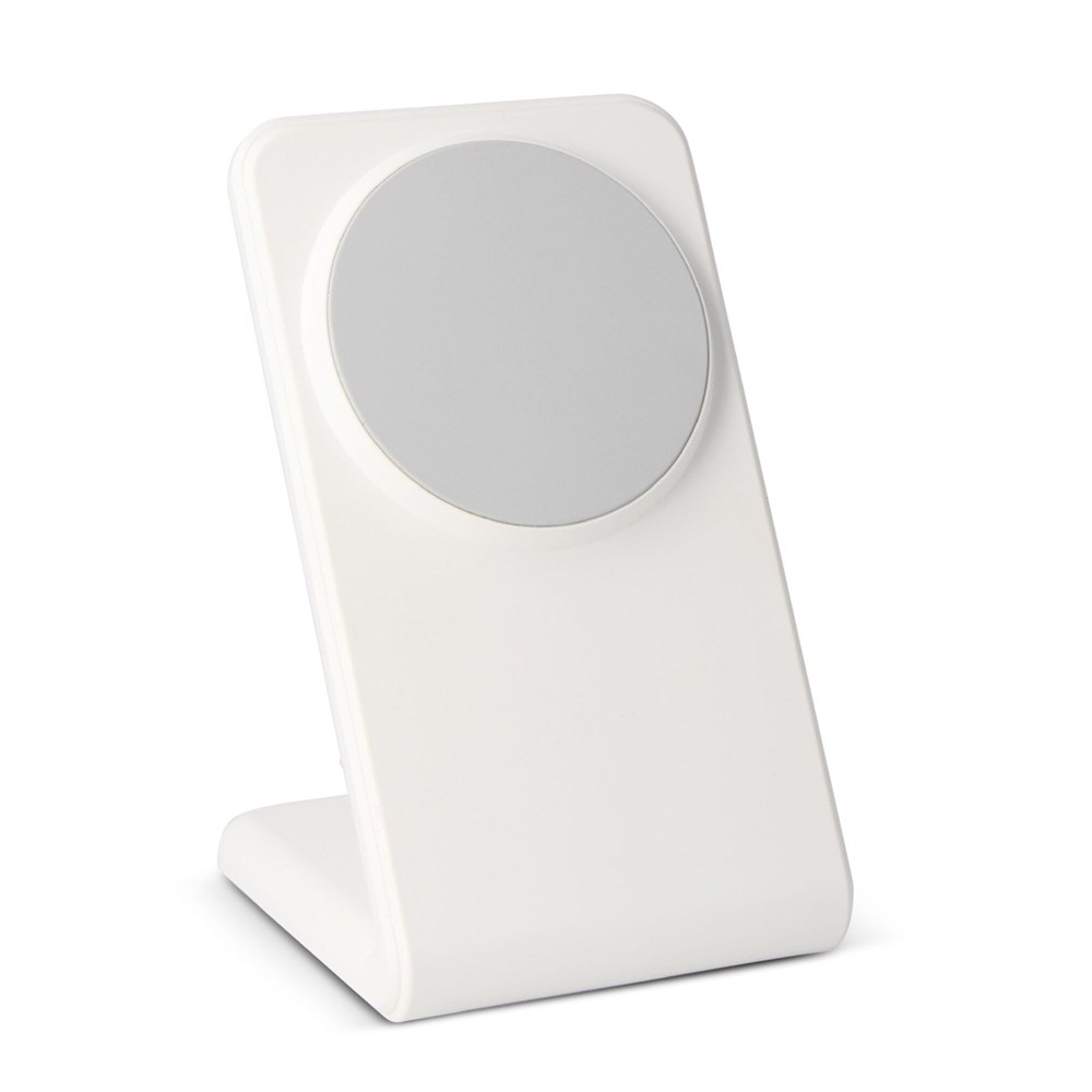 This wireless charger offers 15W fast charging. It supports outputs of 5W, 7.5W, 10W, and 15W max. It is made from durable recycled ABS (R-ABS). The charger is available in white and black. It is compatible with MagSafe technology for efficient power transfer.