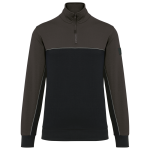 60% katoen / 40% gerecycleerd polyester. Aan de binnenkant geborsteld fleece 3 draden LSF (Low Shrinkage Fleece). Rechte snit. Ingezette mouwen. Kraag met plastic rits en gerecycleerde toon-op-toon ritstrekker. Contrasterende nektape met visgraatmotief. Halvemaanvormige halsopening op de achterkant, voor eenvoudige personalisatie van het merk aan de binnenkant. Contrasterende bies tussen de tweekleurige delen van het kledingstuk (lichaam, voorkant mouwen en rug). 1×1 ribboord aan mouwuiteinden en boord. Elastische penhouder met 3 vakken op de linkermouw. Tear-away merklabel.