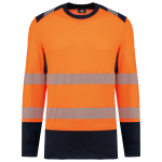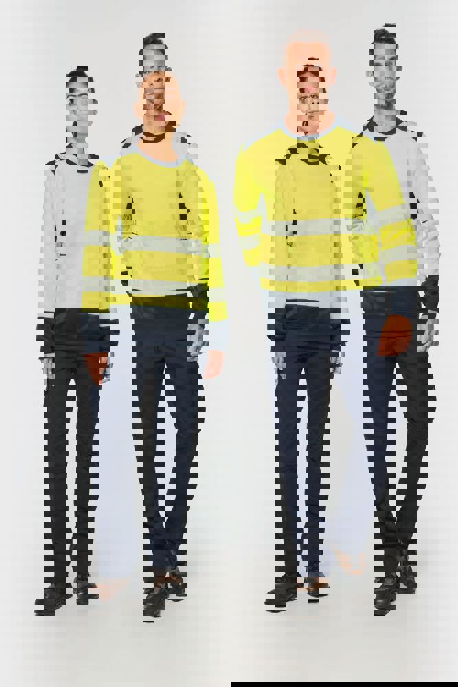 65% gerecycled polyester / 35% katoen. Gekamd katoen. Geborsteld fleece. Anti-pilling behandeling. Wasbaar op 60°C (25 wasbeurten). Regular fit. Contrasterende schouderinzetten met een 5 cm brede segmentreflecterende band. Kraag gevoerd met 100% gerecycled polyester in 1×1 ribboord. Contrasterend inzetstuk onder de armen. Twee segmentreflecterende banden van 5 cm aan de voor- en achterkant en op de mouwen. Contrasterende onderkant van de mouwen en het kledingstuk. 1×1 ribboord in contrasterend 100% gerecycled polyester aan de onderkant van de mouwen en het kledingstuk. PBM Klasse II. Normen NF EN 13758-1+A1:2007 + NF EN 13758-2+A1:2007: UPF40+ bescherming tegen UV-straling, NF EN ISO 13688:2013 + NF EN ISO 13688/A1:2021 (Algemene eisen voor beschermende kleding), NF EN ISO 20471:2013 + NF EN ISO 20471/A1:2017: Klasse 2 (Hoge zichtbaarheid kleding – testmethoden en eisen), RIS-3279-TOM Issue 2:2019 alleen voor de kleur Hi Viz Oranje/Marine (Spoorwegindustrie norm). Afneembaar merketiket.