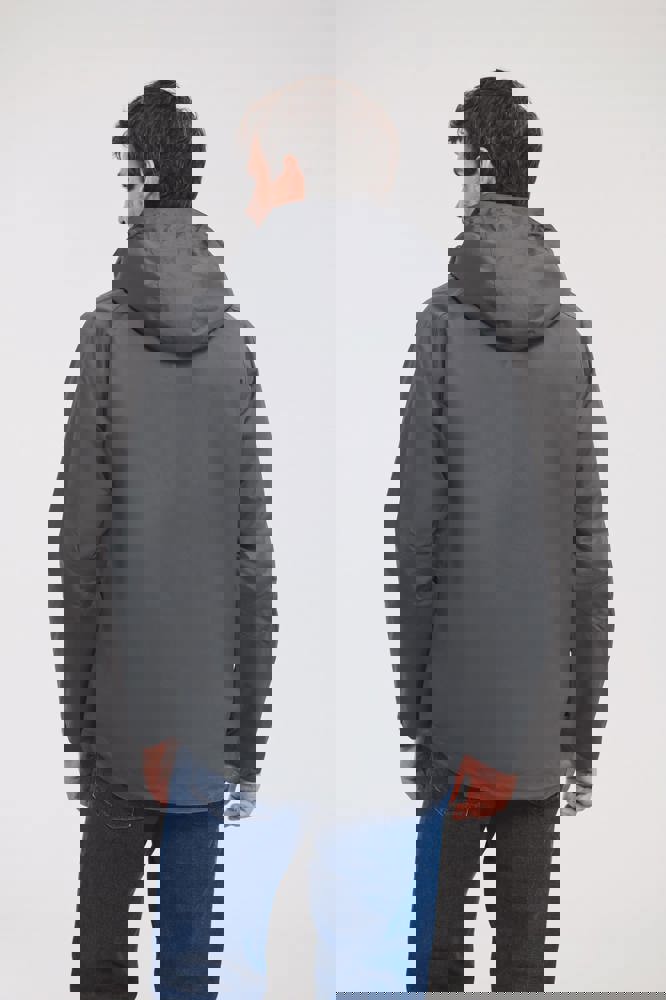 De drielagige capuchon kan netjes in de gevoerde kraag worden opgeborgen.