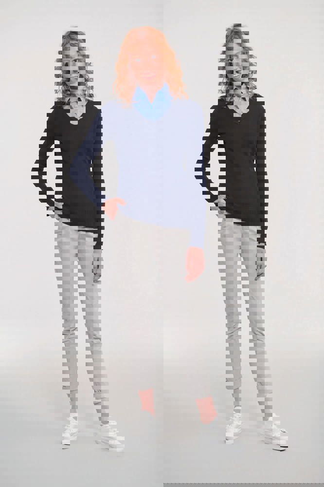 De RU710F Ladies’ V-neck Knitted Pullover is een gebreide trui voor dames met een klassieke V-hals. Dit product combineert 50% katoen met 50% polyacryl. Dit materiaal staat bekend als CottonBlend. De trui heeft ingezette mouwen (set-in mouwen). De manchetten en de onderkant zijn voorzien van een ribboord met elasthan. Dit zorgt voor vormbehoud. De pullover is snel drogend. Je kunt de trui in verschillende maten bestellen, zoals XS tot en met XXL. Beschikbare kleuren zijn Black, French Navy en Charcoal Marl.