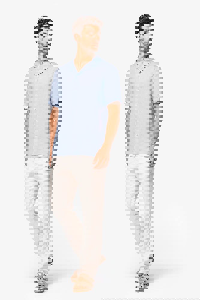 Dit is een geweven overhemd van 100% linnen. Het heeft een moderne, rechte pasvorm. Het ontwerp is voorzien van een klassieke bowlingkraag. De knooplijst is afgewerkt met contrasterende parelmoeren knoopjes. Deze knoopjes zijn gemaakt van gerecycled plastic. Het kledingstuk is na montage gewassen. Hierdoor kunnen de kleuren per item licht variëren.