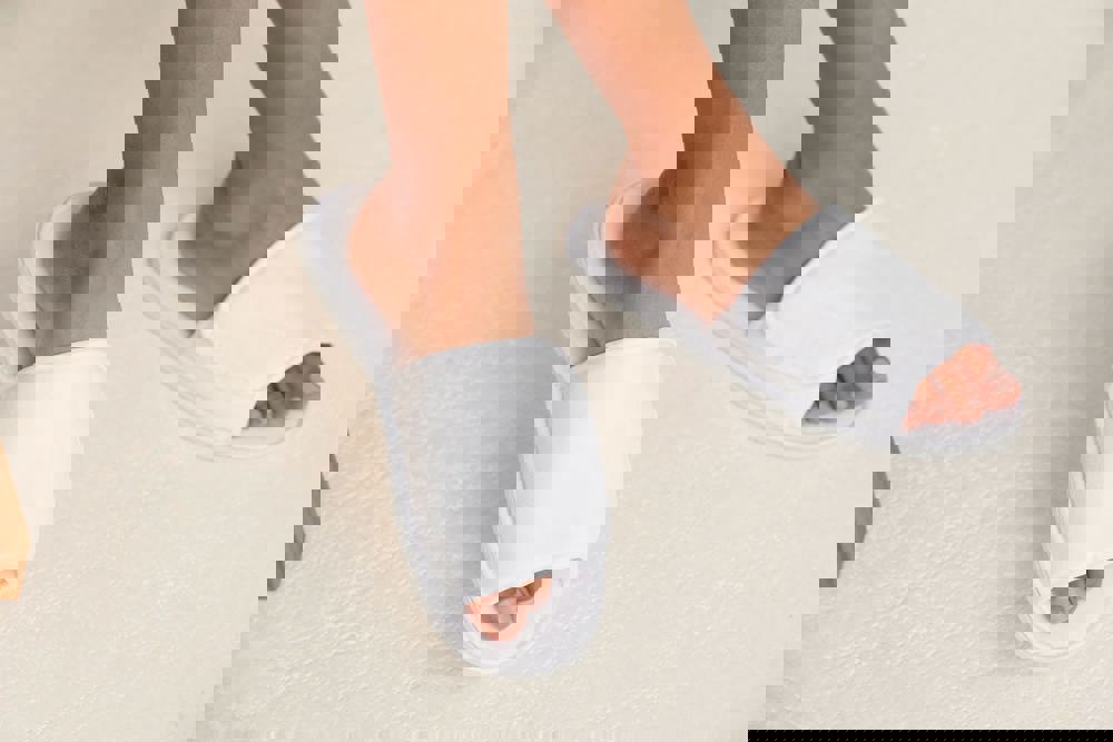 De slippers zijn ontworpen met een open teen en een klittenbandsluiting.