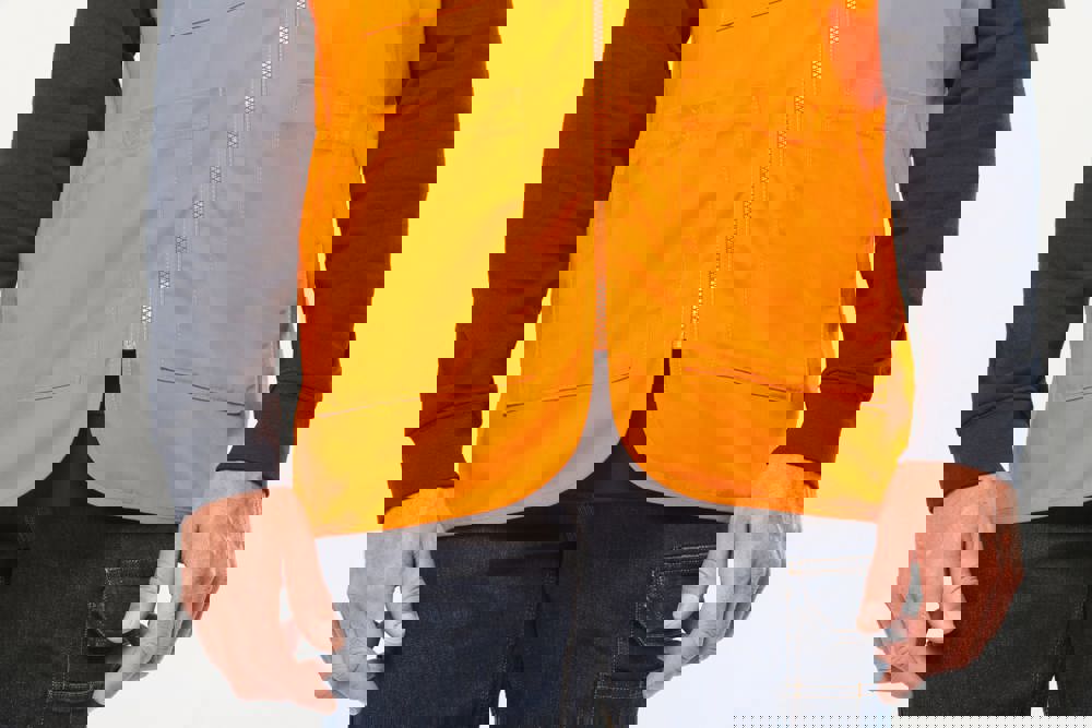 De bodywarmer heeft een samenstelling van 65% polyester en 35% katoen. De snit is recht. Er zijn twee grote opgezette zakken aan de voorkant met klittenbandsluiting. Daarnaast is er één opgezet borstzakje. Dit borstzakje bevat een speciaal pennenvakje. De sluiting is een ton-sur-ton plastic ritssluiting. De bodywarmer heeft een licht verlengd achterpand. Er is een ton-sur-ton biesje bij de mouwopeningen en de randen. Aan de binnenkant zit een naamlabel.