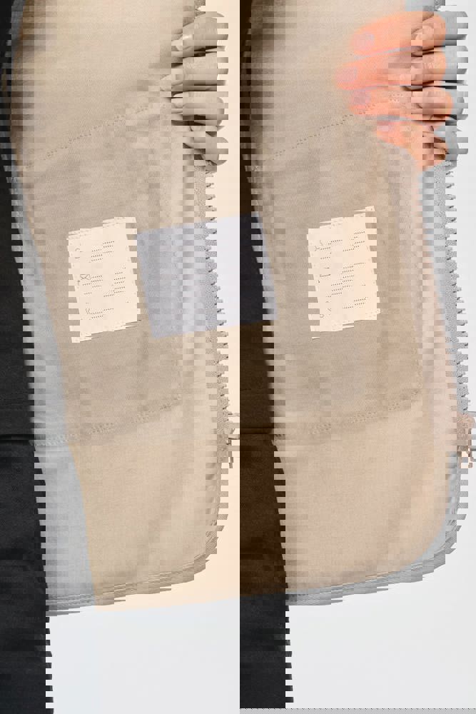 De buitenkant van de bodywarmer is 65% polyester en 35% katoen. De voering is volledig van polyester. De bodywarmer heeft een half gevoerd achterpand met mesh. Er zijn twee dubbele opgezette zakken aan de voorzijde. Eén zak heeft een klep. De andere zak heeft een ton-sur-ton rits. Er zijn drie extra opgezette zakken met klittenbandsluiting. Het achterpand is licht verlengd. Er zit een naamlabel aan de binnenkant. De bodywarmer heeft een tear-away merklabel.