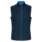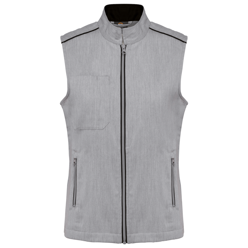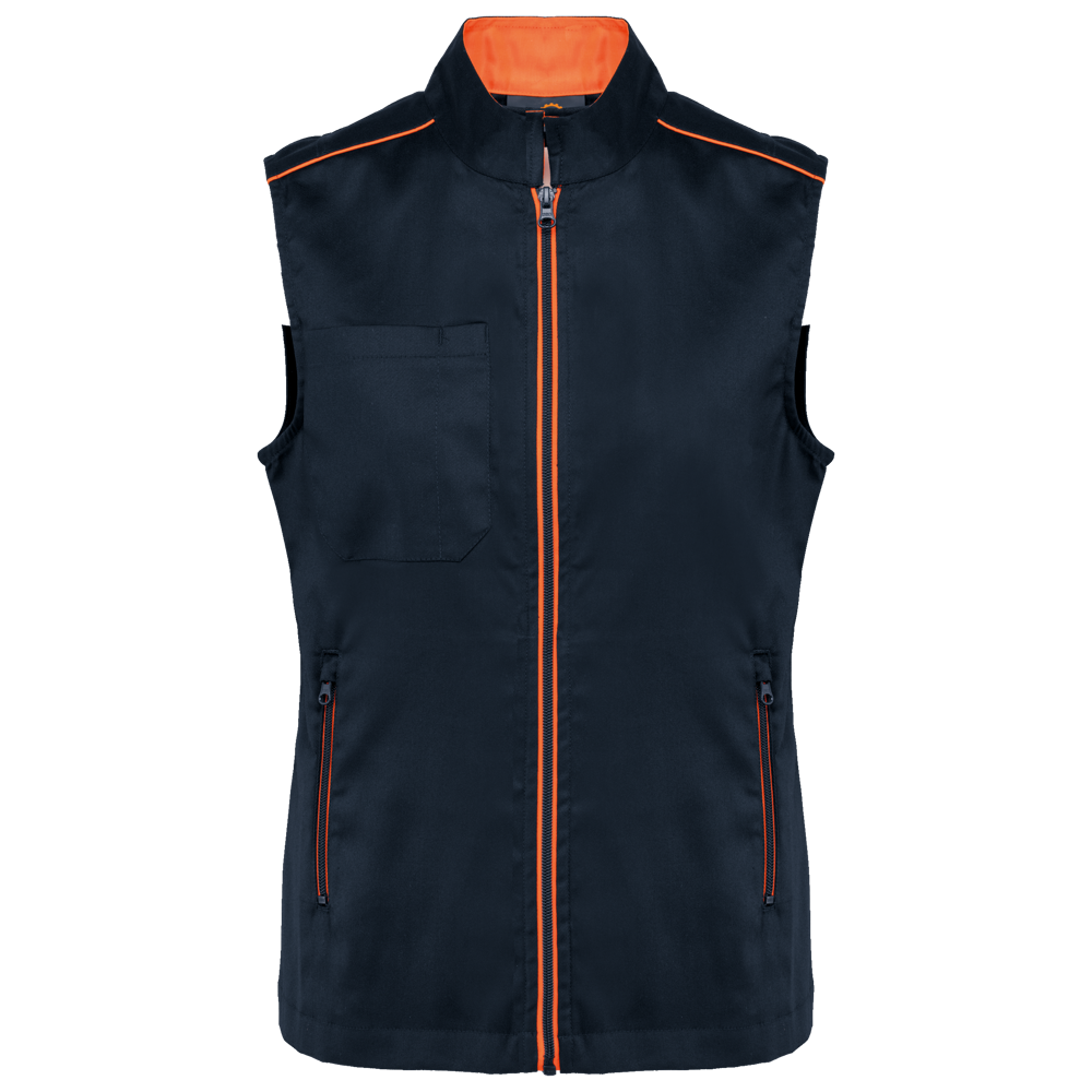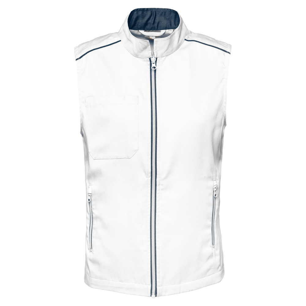 Het damesgilet heeft een praktische ritssluiting aan de voorkant. Er zijn twee ritszakken aan de zijkant voor het veilig opbergen van spullen. De rechter borstzak is open en beschikt over een penhouder. De contrasterende binnenkant van de kraag heeft een ophanglus. De schouders zijn voorzien van een contrasterende bies. Binnenin vind je een naametiket. Er zijn twee ruimtesplitten op de achterkant voor bewegingsvrijheid.