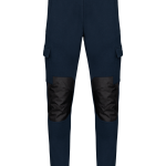 De broek heeft een comfortabele rechte snit. De tailleband is elastisch en voorzien van aanrijgkoordjes met een rubberen uiteinde. Je profiteert van twee omzoomde zakken aan de voorkant. Er zijn twee opgezette cargozakken met een klep en klittenbandsluiting. De zwarte knielappen zijn gemaakt van slijtvast Cordura®. De broekspijpen zijn afgewerkt met een 2x2 ribboord met elasthan. De broek is beschikbaar in de kleuren Navy en Black en in verschillende maten.