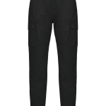De cargobroek heeft een functioneel ontwerp met meerdere opbergmogelijkheden. Er zijn twee zakken aan de voorkant. Daarnaast zijn er twee ruime zijzakken met kleppen en drukknopen. De broek heeft één omzoomde achterzak met een ritssluiting. De knieën zijn verstevigd met inzetsels van de hoofdstof. De tailleband is elastisch voor extra draagcomfort. De broekspijpen hebben elastiek aan de onderzijde. Voor extra stevigheid is driedubbel stiksel toegepast op kritieke naden.