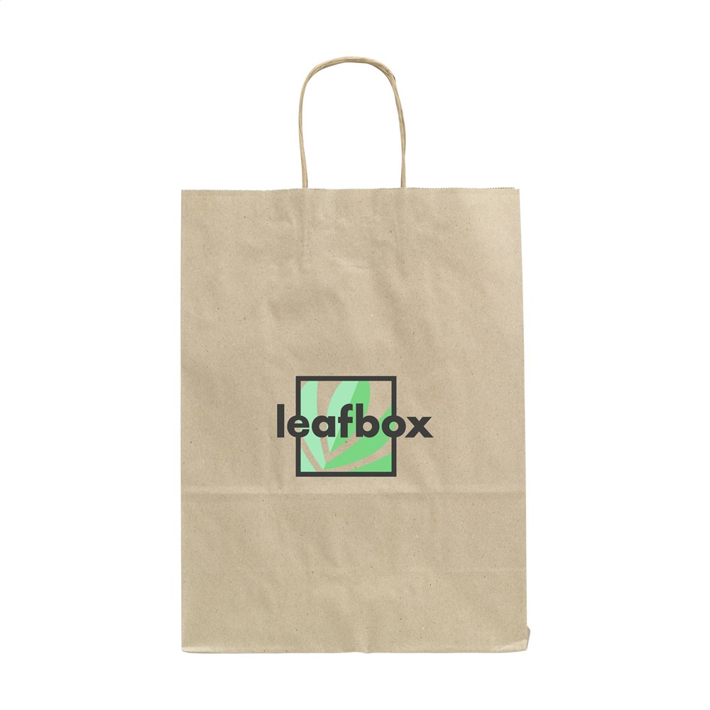 Maak een duurzame statement op de beurs met deze unieke gerecyclede tas, gemaakt van stevig graspapier. Gebruik deze milieuvriendelijke papieren zak als high-end goodie bag of opvallende giveaway. Laat je logo professioneel bedrukken voor een perfecte presentatie.