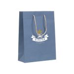 Dit is de Leaf It Bag, een duurzame geschenktas in maat M. Deze tas is vervaardigd uit gerecycled papier en verrijkt met jeansvezels. Het materiaal heeft een gewicht van 180 g/m², wat zorgt voor stevigheid. De donkerblauwe kleur ontstaat door de gerecyclede denim. Hierdoor kan de exacte blauwtint per tas licht variëren. Deze papieren promotas is een milieubewuste keuze. Er worden geen bomen gekapt voor de productie van deze tas. Je kunt deze tas laten bedrukken met jouw eigen logo of boodschap.